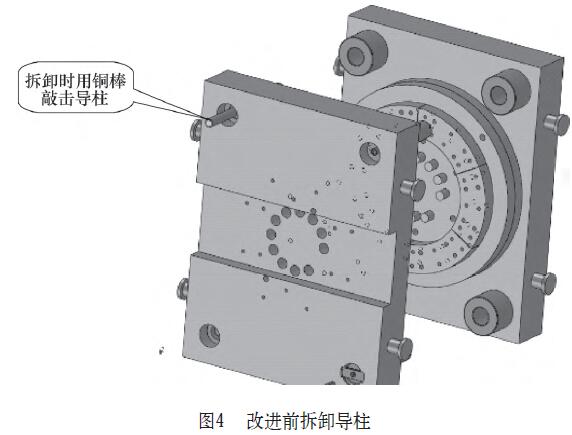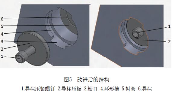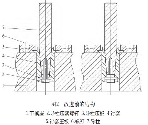 通常在拆卸導(dǎo)柱時,先用內(nèi)六角扳手將導(dǎo)柱壓緊螺釘拆卸、取出導(dǎo)柱壓板,然后用銅棒敲擊導(dǎo)柱下平面,使導(dǎo)柱與襯套分離,取出導(dǎo)柱(見圖1~圖4)。