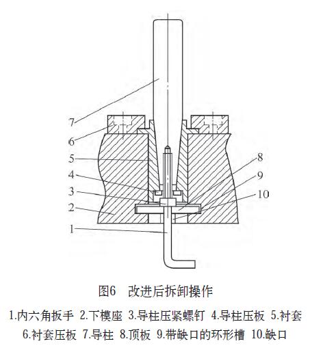 在拆卸導(dǎo)柱時,將頂板從模座導(dǎo)柱孔下方的缺口放入模座的環(huán)形槽里,旋轉(zhuǎn)90°卡在環(huán)形槽里,再將內(nèi)六角扳手通過頂板中心的圓孔將導(dǎo)柱壓緊螺釘擰出(逆時針)。當(dāng)導(dǎo)柱壓緊螺釘與頂板接觸后,繼續(xù)旋轉(zhuǎn)導(dǎo)柱壓緊螺釘,此時導(dǎo)柱在螺釘?shù)男D(zhuǎn)力作用下,使導(dǎo)柱和襯套分離,導(dǎo)柱拆卸完成,如圖6所示。
