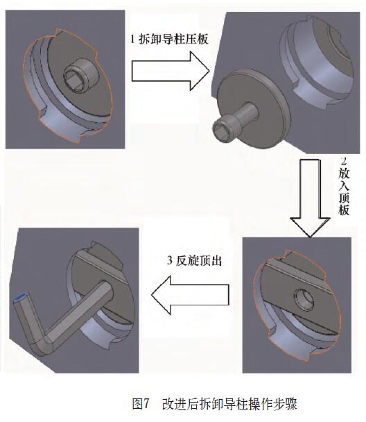 改進(jìn)后拆卸導(dǎo)柱時,通過反向旋轉(zhuǎn)導(dǎo)柱,壓緊螺釘就可使導(dǎo)柱和襯套分離,不用對電機模具進(jìn)行翻轉(zhuǎn),并且省略了傳統(tǒng)拆卸時通過敲擊使導(dǎo)柱和襯套分離,從而避免了敲擊導(dǎo)致的對導(dǎo)柱、襯套的磕碰,也避免了敲擊帶來的對操作者安全隱患(見圖7)。通過統(tǒng)計核算,該項改進(jìn)在大型電機模具模具的全壽命周期內(nèi),可節(jié)約成本5萬元。每年可為公司創(chuàng)造效益約50余萬元。